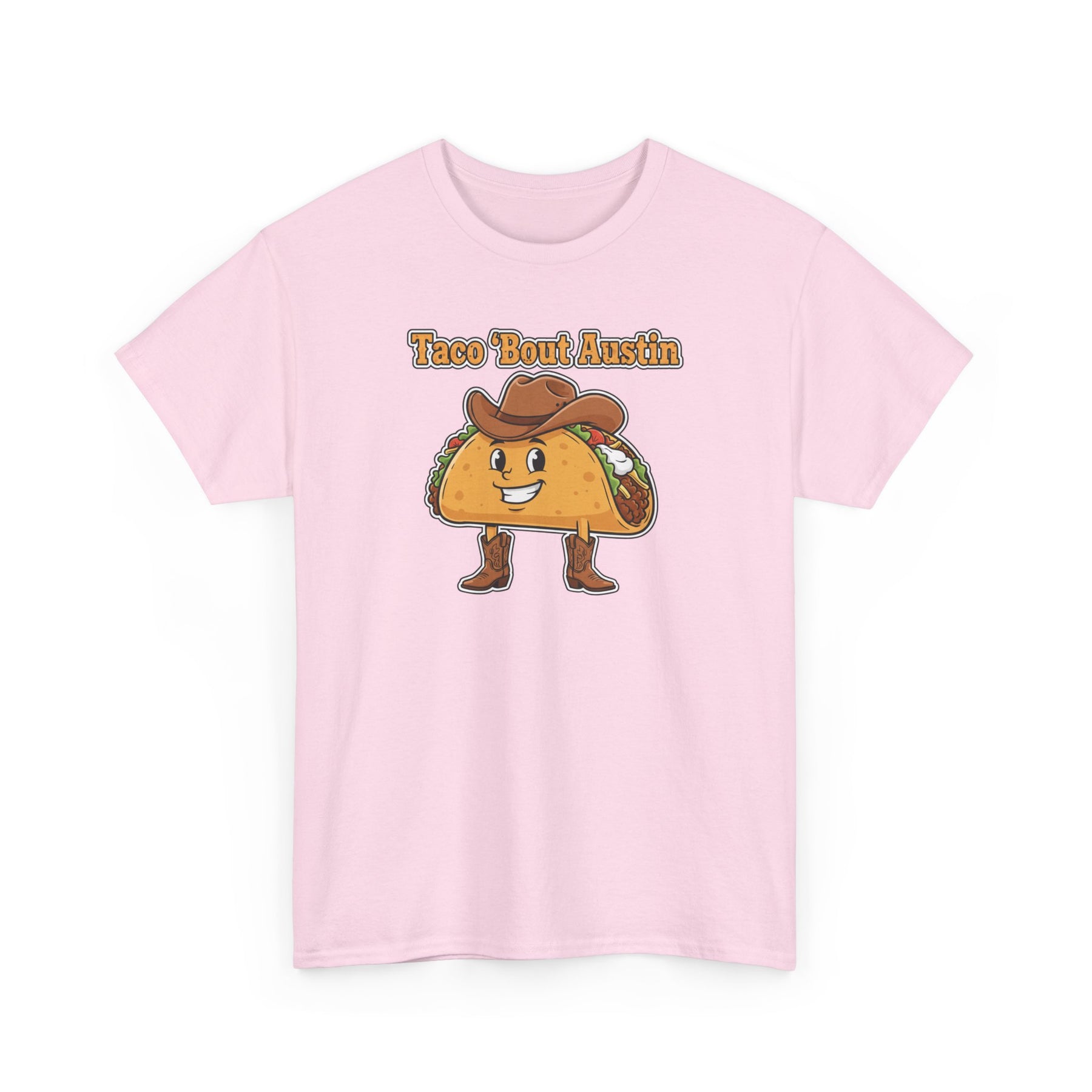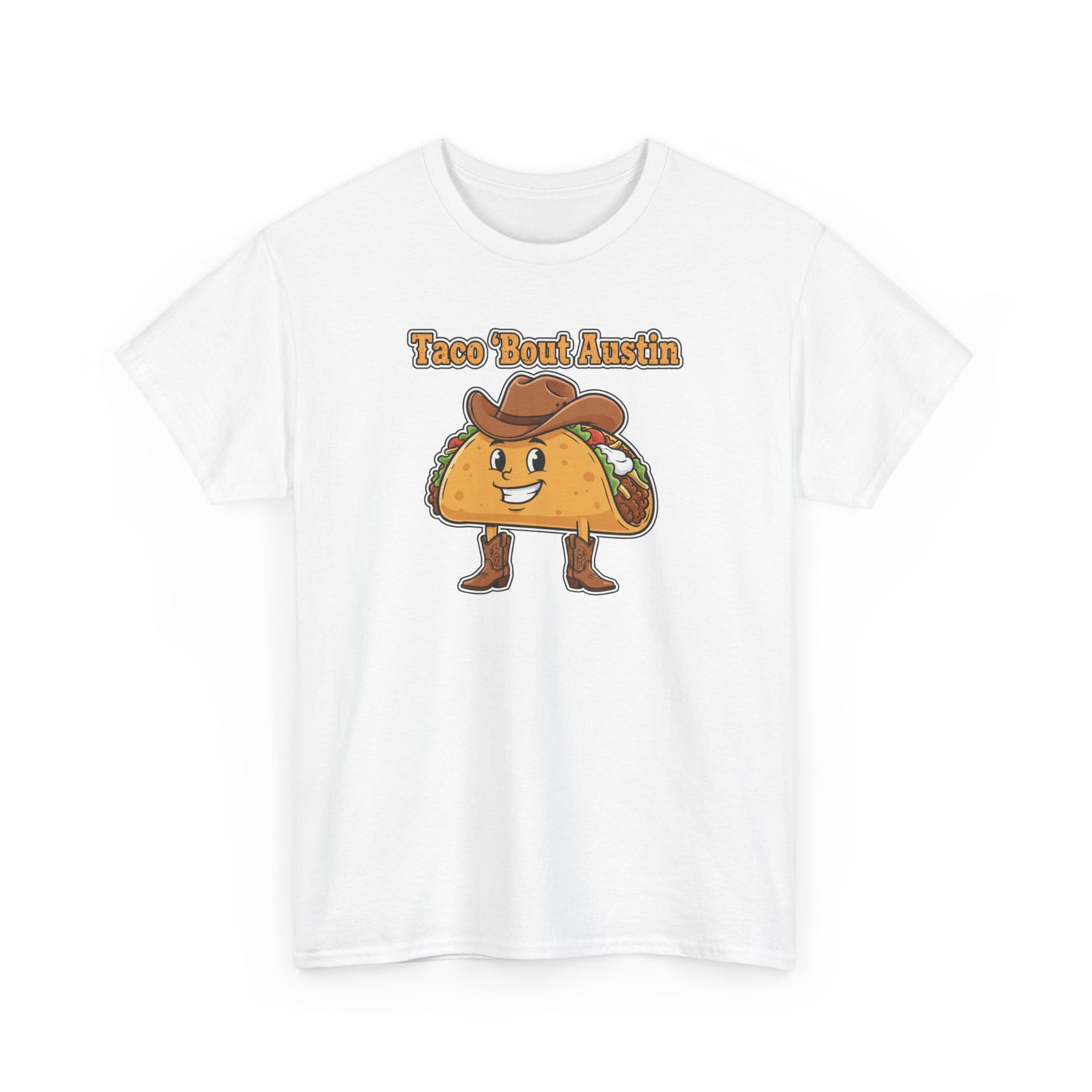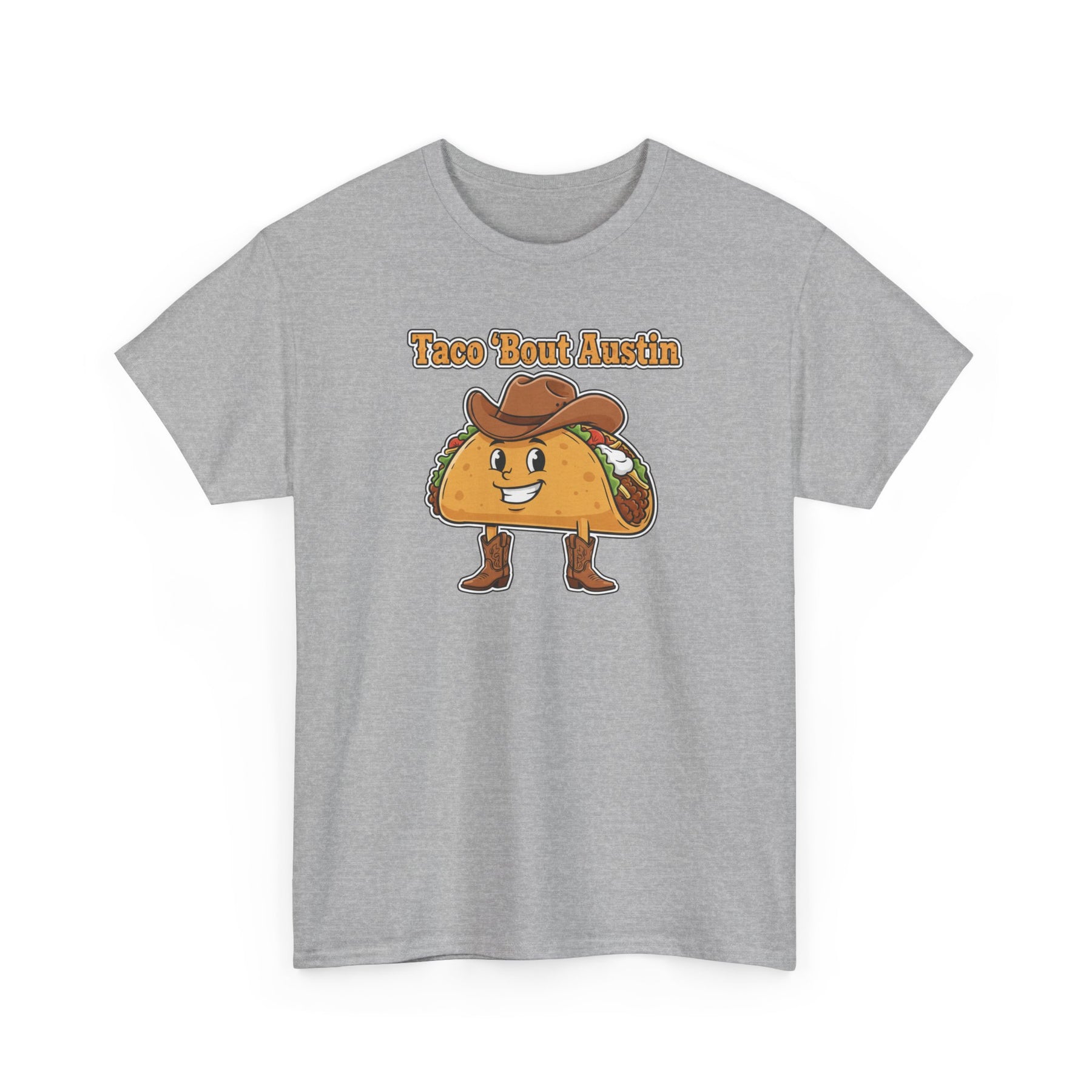 • Soft, breathable cotton blend for all-day comfort • Unisex classic fit with crew neck and short sleeves • Bold “Taco ’Bout Austin” graphic featuring a smiling taco in cowboy boots and hat • Durable print and double-stitched seams to withstand repeated washes